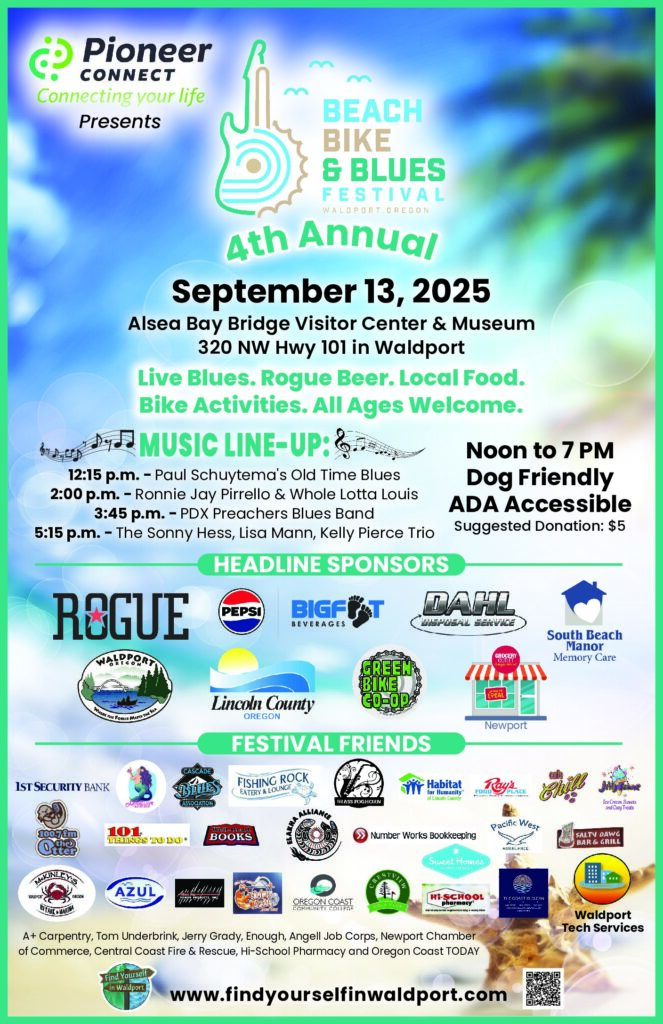 BEACH, BIKE & BLUES FESTIVAL returns to The Alsea Bay Bridge Visitor Center & Museum overlooking the Alsea Bay with fun new bike activities from our friends at Green Bike Co-Op.