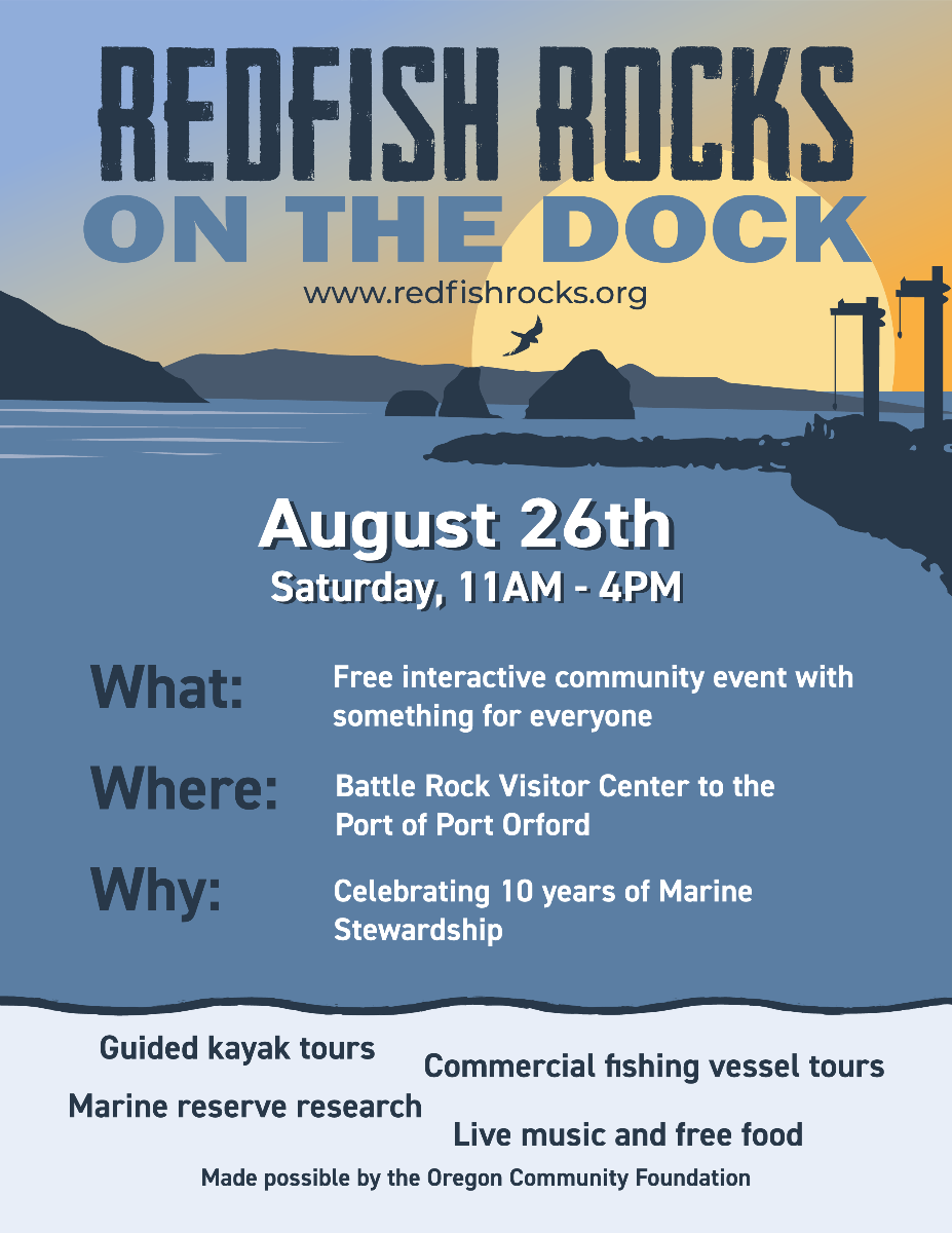 The Redfish Rocks on the Dock community event will occur on Saturday, Aug. 26, from 11 a.m.-4 p.m. from the Battle Rock Visitor Center (520 Jefferson St in Port Orford) to the Port of Port Orford (300 Dock Rd). The Elakha Alliance will be tabling at the event, so come say hello!