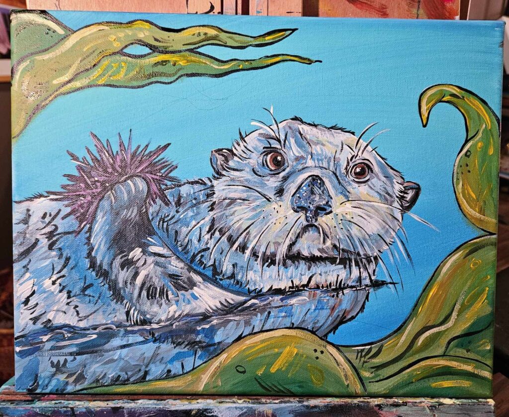 No experience is needed, so all artistic skill levels are welcome. Step-by-step painting instruction is provided by a talented artist (and Oregon Zoo Marine Life Keeper) Megan Tate Hagedorn. The example of the painting is the featured email at the top of a sea otter floating in bull kelp holding a sea urchin.